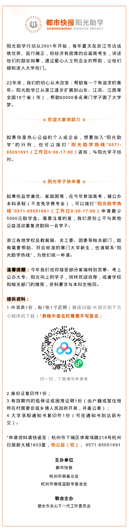 如果你也想帮助寒门学子圆大学梦,或者你身边有希望圆梦的寒门学子,都可以拨打都市快报阳光助学热线0571-85051691(工作日9:30-17:00)咨询,谢谢你们对阳光学子的支持和鼓励。你也可以关注“快公益”微博、微信,获取更多助学信息。