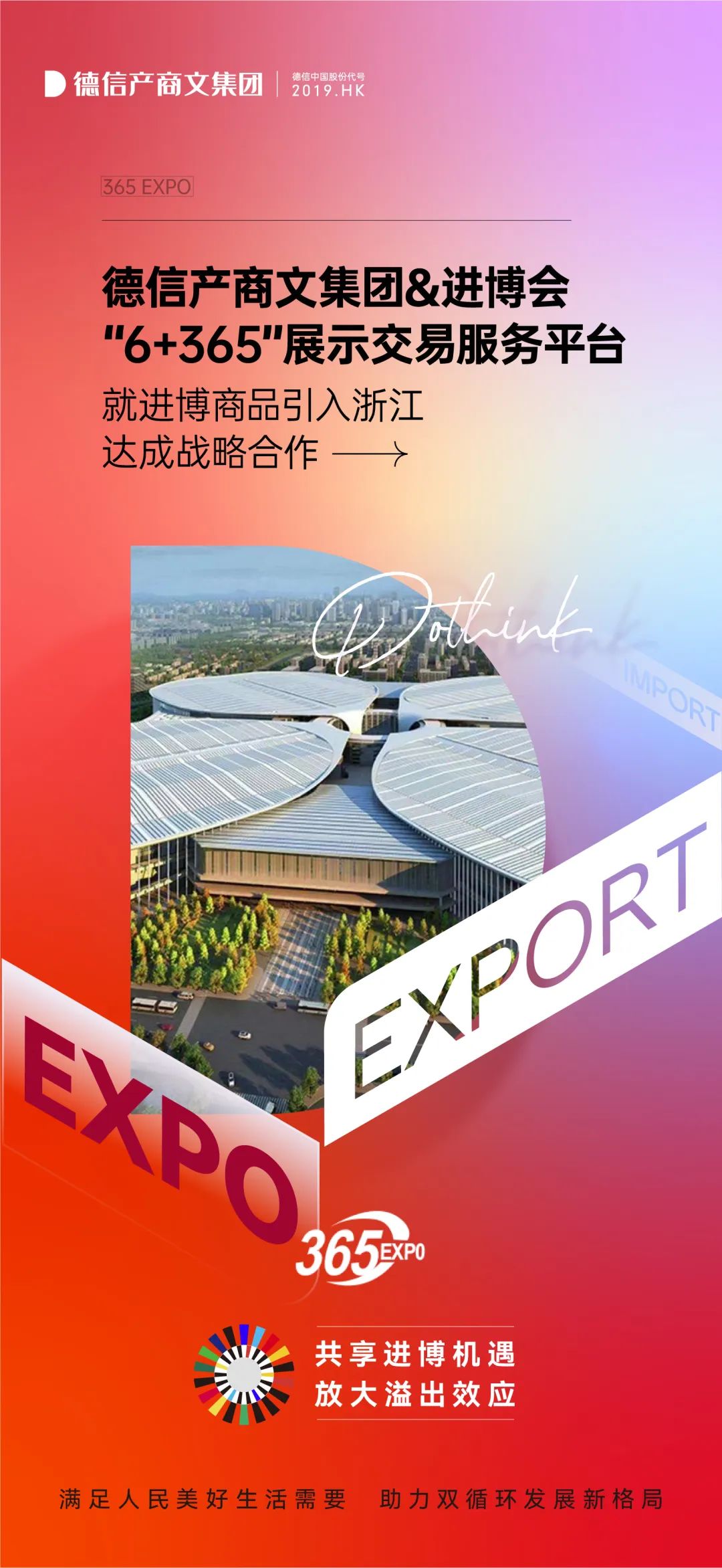 此次战略合作协议的签署,标志着德信产商文集团将通过“6+365”交易服务平台,把“进博集市”引入浙江,承接和放大进博会溢出效应,满足人民美好生活需求,助力双循环发展新格局。