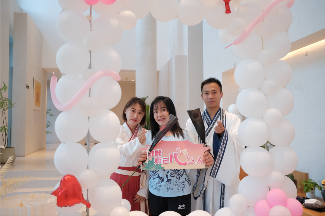 在首望中心,园区充斥着浪漫的粉红泡泡,甜度爆表的氛围感也瞬间拉满!在郡望府、首望中心、九溪云庄等小区里,管家、秩序员更是穿上国风古装,化身衣袂翩翩“牛郎织女”,在小区门口为来往的业主送上鲜花和祝福。
