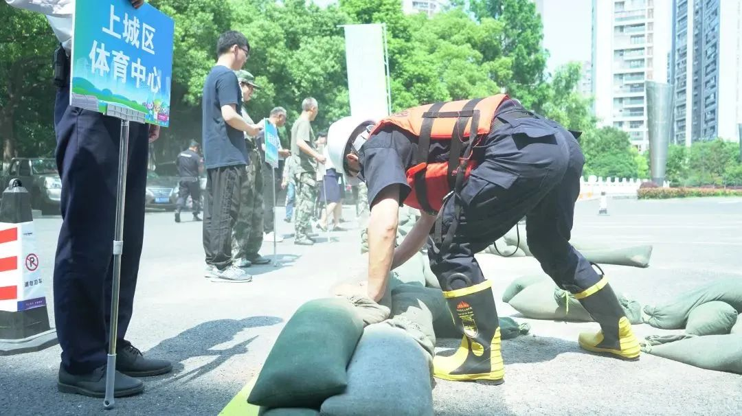 现场实际演练了人员紧急集结、队容队貌展示、防汛沙袋叠放、抽水泵使用等多个科目,充分展现了为即将到来的亚运盛会保驾护航的实力与决心。